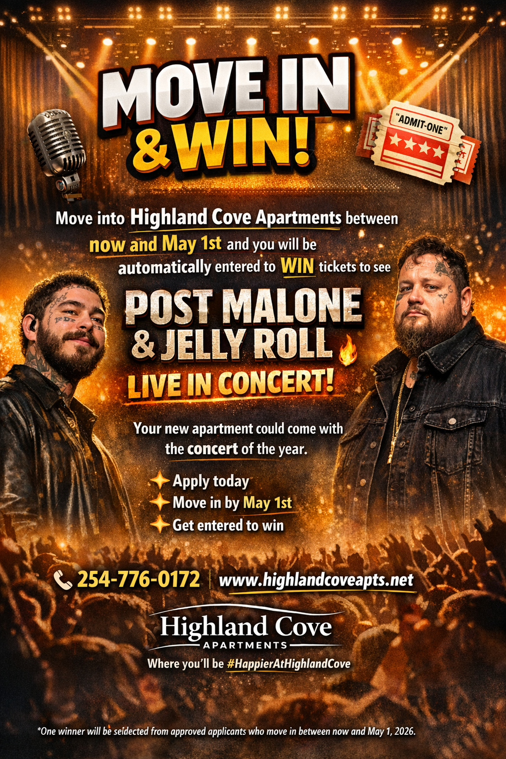 Anyone who moves into Highland Cove before May 1st will be entered to win concert tickets to see Post Malone and Jelly Roll! If you’ve been thinking about making Highland Cove your new home, now is the perfect time to secure your apartment and get entered for a chance to win. Spots are filling quickly, so reach out to schedule a tour or start your application today! We hope to welcome you home soon, Highland Cove Leasing Team.